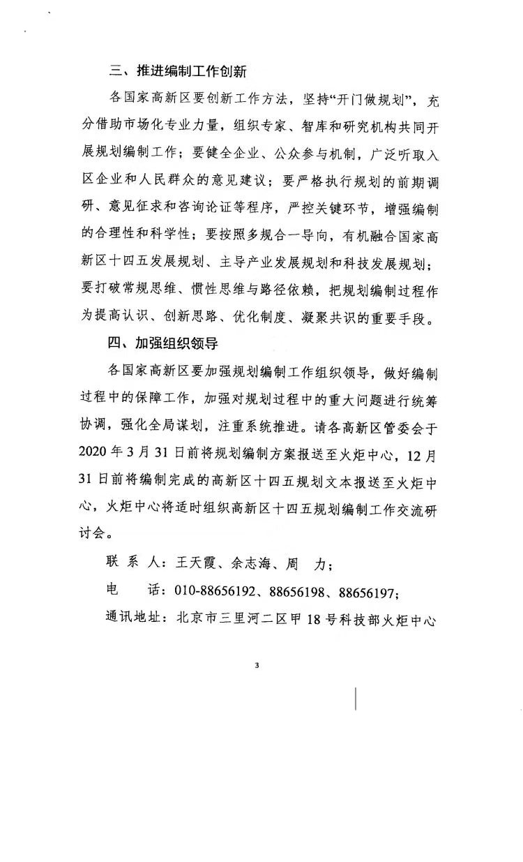 各國(guó)家高新區(qū)要加強(qiáng)規(guī)劃編制工作組織領(lǐng)導(dǎo),做好編制過(guò)程中的保障工作,加強(qiáng)對(duì)規(guī)劃過(guò)程中的重大問(wèn)題進(jìn)行統(tǒng)籌協(xié)調(diào),強(qiáng)化全局謀劃,注重系統(tǒng)推進(jìn)。請(qǐng)各高新區(qū)管委會(huì)于2020年3月31日前將規(guī)劃編制方案報(bào)送至火炬中心,12月31日前將編制完成的高新區(qū)十四五規(guī)劃文本報(bào)送至火炬中心,火炬中心將適時(shí)組織高新區(qū)十四五規(guī)劃編制工作交流研討會(huì)。